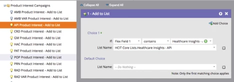Within Marketo, there is a Smart Campaign flow step called “Add to List.” Within the flow step, there is a button on the Top Right called “Add Choice” which acts as IF/THEN type of logic. Putting in multiple choices in a single step means that Marketo will look for the first time the conditions are true and then abandon the rest of the choices. Alternatively, you can add multiple flow steps. The example below is from the Product Preference project in place for Europe, where information that maps to a single, temporary Marketo fields needs to be stored permanently. The information is delivered with multiple values at once, which then need to be separated into lists. It’s worth noting that almost 100 static lists are used to track interest in products for Core Imaging alone.
