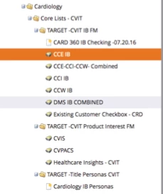 In this example, we have created lists for our various Cardiology products. Lists marked as “IB” are current customers. CCE is one version of our product, CCI, CCW and DMS are other versions. Because this product line is very volatile – new products are constantly added, product names are subject to change and product lines can be retired – having these products as unique fields is not scalable. While the product is called DMS today it could be called ABC or something completely different tomorrow. Once a field is created in Marketo and is populated with data you cannot change the field name. It is also very labor intensive to remove fields.