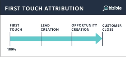 The First Touch model only focuses on the very first interaction a lead has with your organization. This model attributes 100% of the attribution credit to the first time the lead became aware of your company, the First Touch (FT).