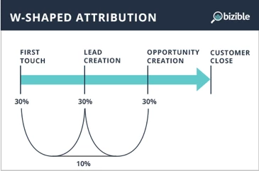 W-Shaped Model: Three of the milestone touchpoints are included in the W-Shaped model. In this model, the FT, LC, and OC touchpoints are each attributed 30% of the attribution credit. The remaining 10% is attributed proportionally to any intermediary touchpoints that occur between the three milestone touchpoints.
