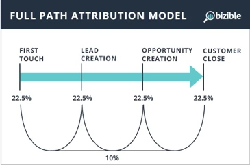 Full Path Model: The full path model includes all four milestone touchpoints. FT, LC, OC and CW are each given 22.5% of the revenue credit, and the remaining 10% is distributed equally among the intermediary touches.