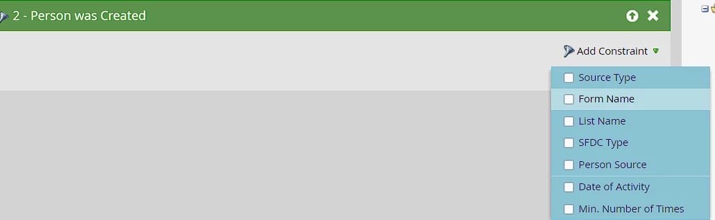 Also, if you only want to apply the suppression criteria on people created via Form Fills/List Imports, then you should also include these as Source Type in the Person Was Created filter along with the Email Address contains <list of competitors domains>. If you have specific Download forms/List names you'd like to add, then use the corresponding Form Name/List Name constraint in the respective Person was Created Source Type filter.