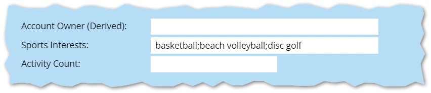 Take a String field Sports Interests. Populated via a Checkboxes field on a form, it holds a semicolon-delimited list. Here’s the value for our test lead: