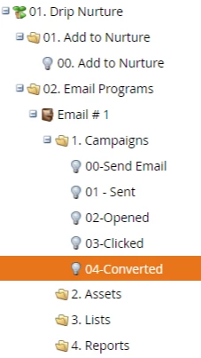 For the engagement program I used the Nurture channel tied to Engagement. For the program within, I used an Email channel tied to Default where the status steps are sent, opened, clicked and converted. This is reflected in the smart campaigns within the email program which will track these status changes.