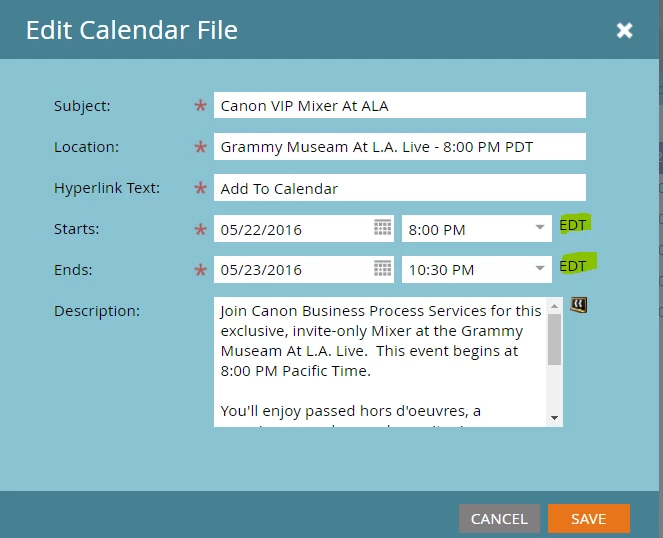 I am using the Calendar token for an event that we are hosting in California. Our instance of Marketo is EST.
