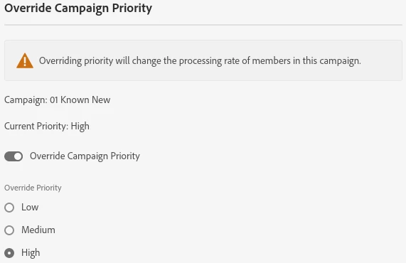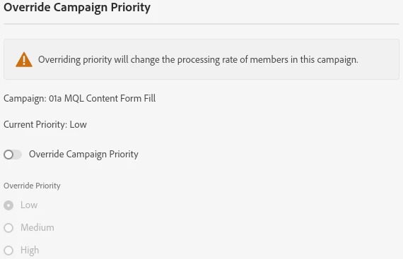 Campaign priority override is a feature that allows you to override the default priority assigned to a trigger campaign to either “Low”, “Medium”, or “High”. The higher the priority a campaign is given, the more it will be prioritized by Marketo and the sooner it will run compared to campaigns with lower priority.