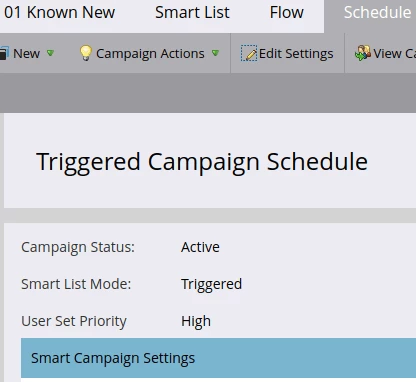 Option 2: Go to the “Schedule” tab of the trigger campaign. If you see the “User Set Priority” parameter then the campaign has been overridden to the priority specified on the right-hand side of this parameter (see the first image below). Otherwise, you will see the “System Priority” parameter with a value of “Default” to indicate that the campaign has not been overridden (see the second image below).