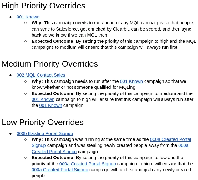 This is why I recommend creating a “Campaign Priority Overrides” document such as this one, which has a section for each priority i.e. Low, Medium, and High, and then all the overridden campaigns with that priority in the respective sections. I also recommend hyperlinking to all the smart campaigns so they are easy to access and change if necessary and including a note about why this campaign was overridden and what you are hoping to happen now that it is overridden.