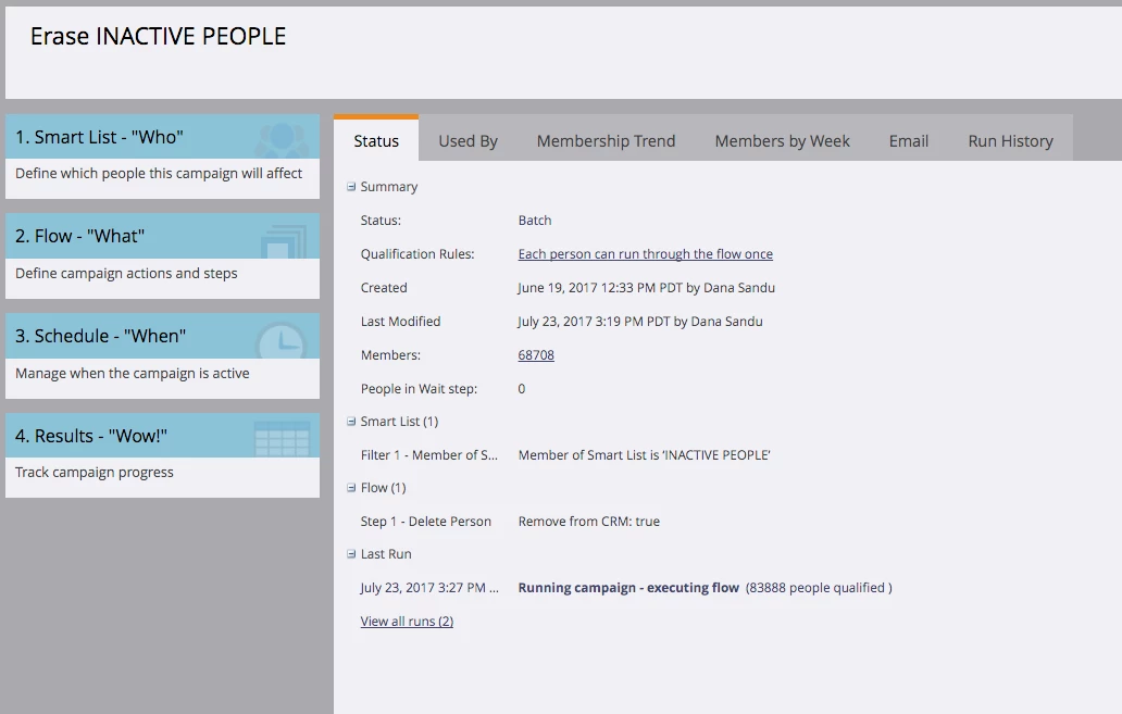 I'm a beginner and trying hard to reduce our number of contacts in the DB so we keep within our new contract's boundaries. So far, I created my functional/active list, a separate list with non-active contacts (=All people-Actives, about 85k), then created a campaign to delete the non-actives. My all people remains unchanged. It's Sunday and I'm getting a headache.... help!