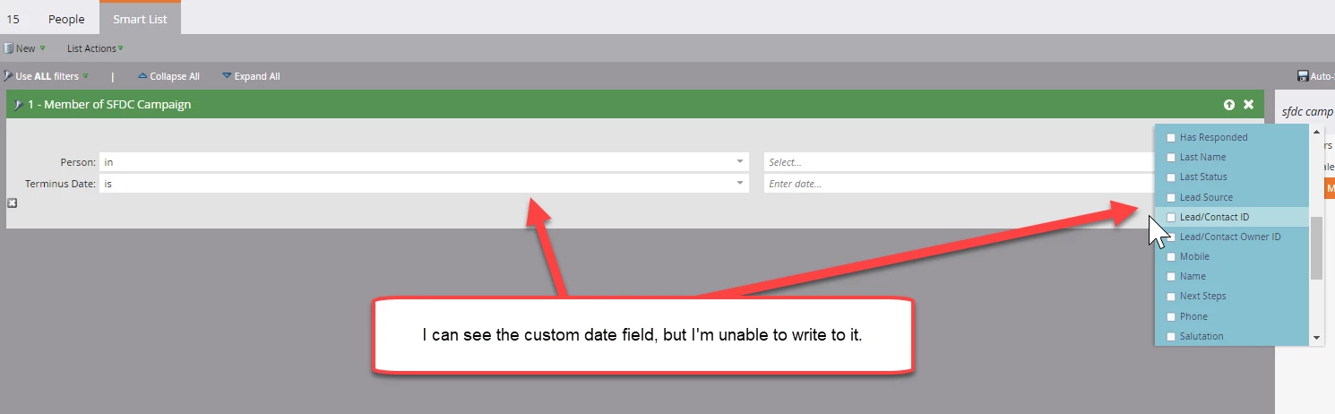 Right now we are using the last modified date in the SFDC campaign object to determine if the person reached a "Success" status before an opportunity is created. We want to change this to a custom field on the campaign member object. I can see this field when I do smart lists in Marketo > member of SFDC Campaign> Add Constraint>It's in that dropdown.