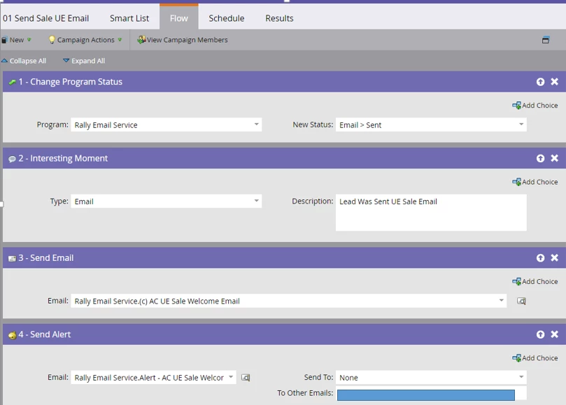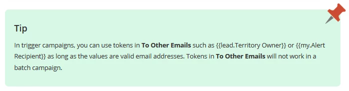 To overcome the lack of cc'ing functionality we are using an alert to send a dupe to our sales team. The email (and dupe copy for sales) content contains a number of {{my.tokens}} the setup is like this: