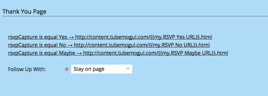I'm trying to make it so the form "ret" value, that is, the page that it redirects to after submission, changes based on the value of a certain radio button on the form. I am building an event RSVP form. Depending on if the user chooses "Yes", "No" or "Maybe" on the form, it will redirect them to a different "Thanks" page with appropriate text. The URL of this thanks page is set by a program token - {{my.RSVP Yes URL}}, {{my.RSVP No URL}}, {{my.RSVP Maybe URL}}.