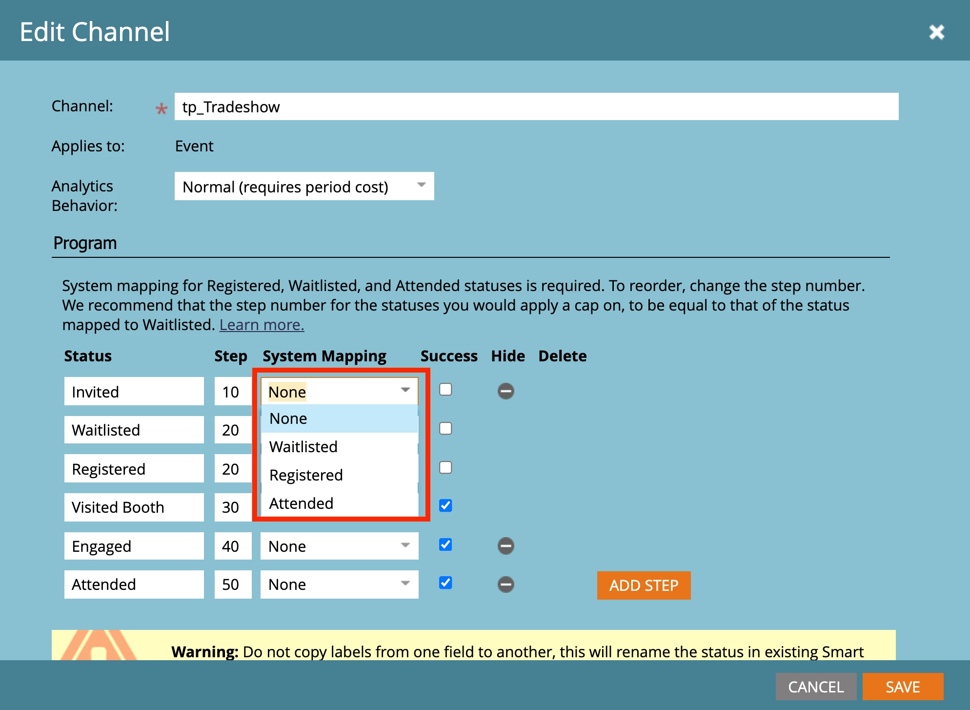 I wanted to edit a channel for a trade show, although under "system mapping" I'm missing the fields "Invited" und "Engaged". The are not exciting in the drop down. I couldn't figure out, how to add those values as a choice in the drop down. Does anyone know?