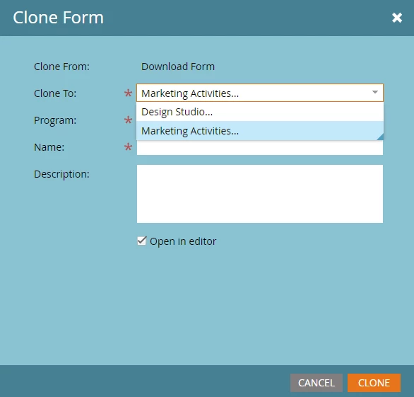 - Clone the asset to the newly created folder NOTE: Form names must be unique. Append the asset name with the workspace name e.g. Content Form (UK)