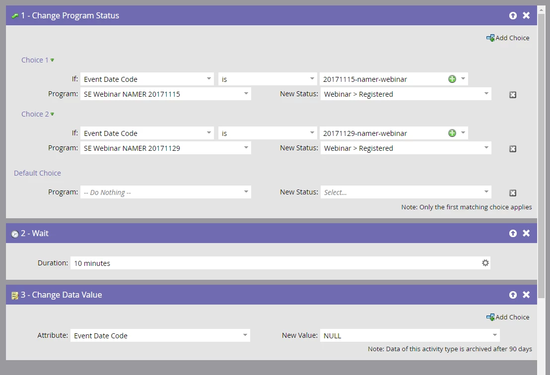 We use a workflow to assign them to the individual webinar events, as we're using GTW for webinar management.