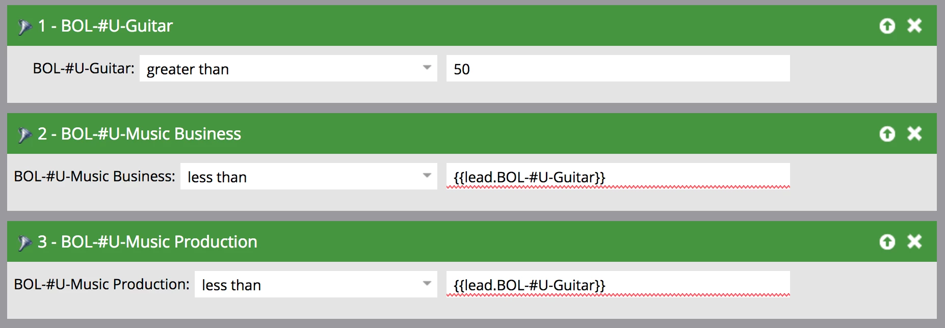 I'm exploring the use of multiple lead scores to determine interest in several products, as well as which of those products has the highest level of interest. Ideally, I would like to set a score threshold to hit, and determine if that score is higher than others. For example: