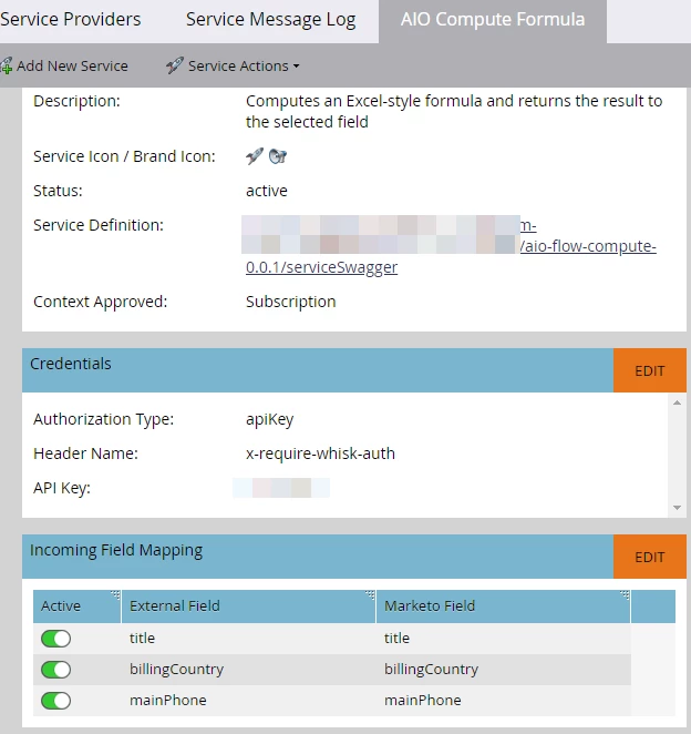 Service setup details with incoming field mapping: