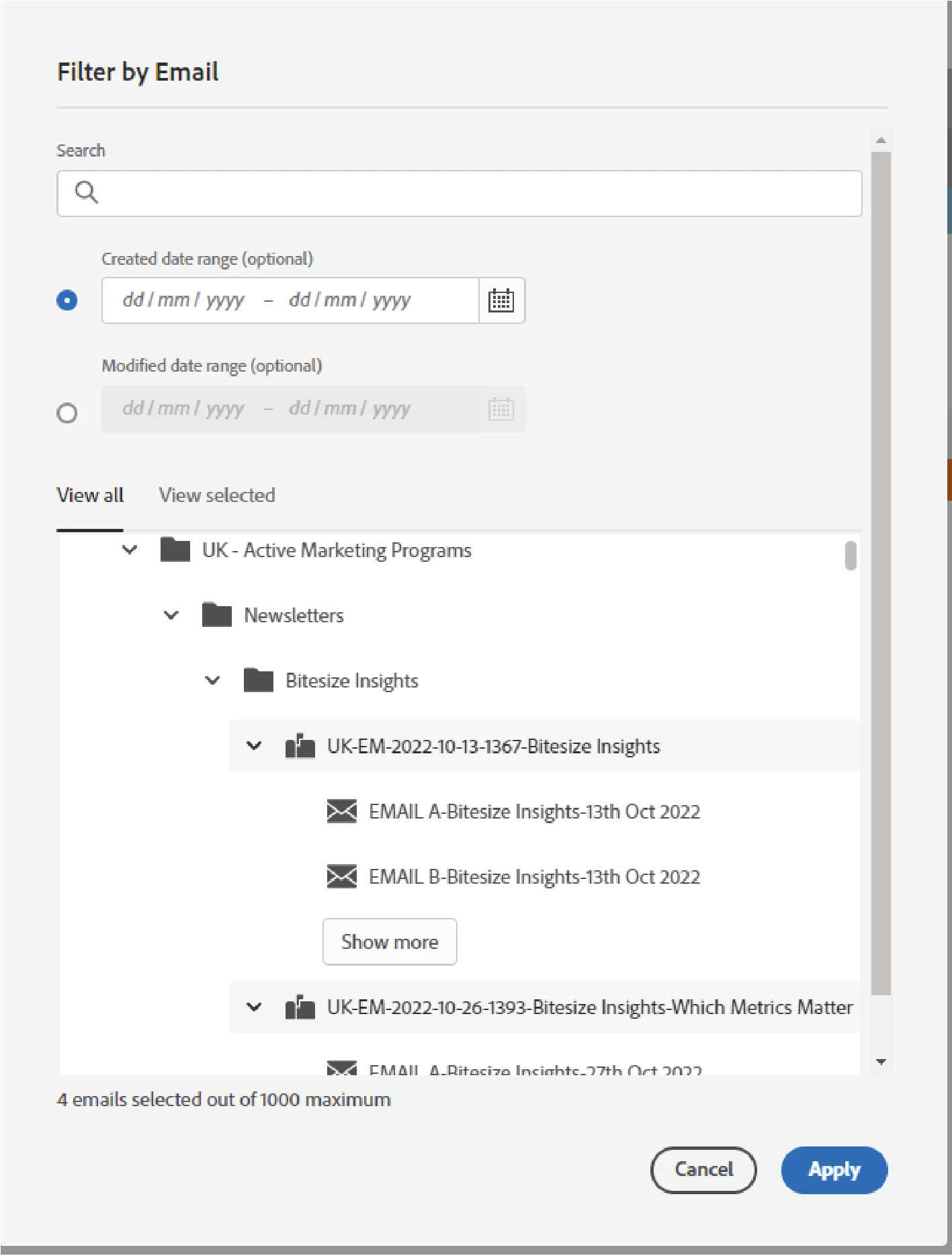 In the new interface for email performance report setup, the selector/filter for emails has poor contrast against a white background (as in the image below). Can I suggest making the contrast of the highlighted/selected emails starker, so visually impaired users can navigate this with more ease?