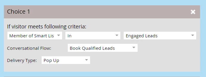 Next, I’ll add a choice and set the audience criteria for anyone who qualifies for my Engaged Leads Smart List. Being able to target on Smart List membership requires Dynamic Chat Prime. Dynamic Chat Select customers can try this feature by targeted values submitted on the form itself.