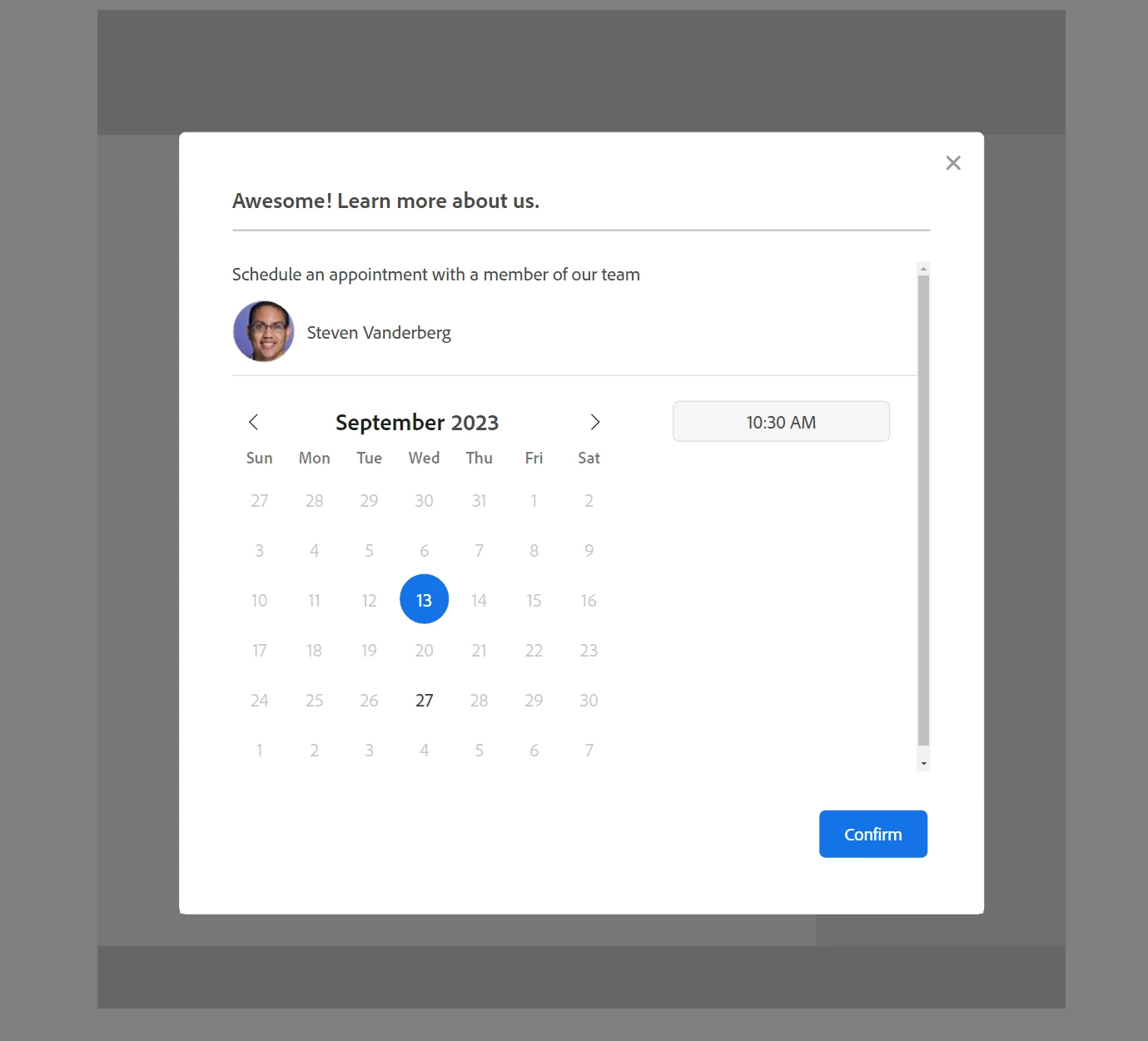 Now when my targeted contacts fill out the form on my website in a cookied browser session, they’ll be offered the option to book a meeting before they’re forwarded to the Thank You page, decreasing the amount of time spent waiting for a response from Sales and negotiating a spot on the calendars.