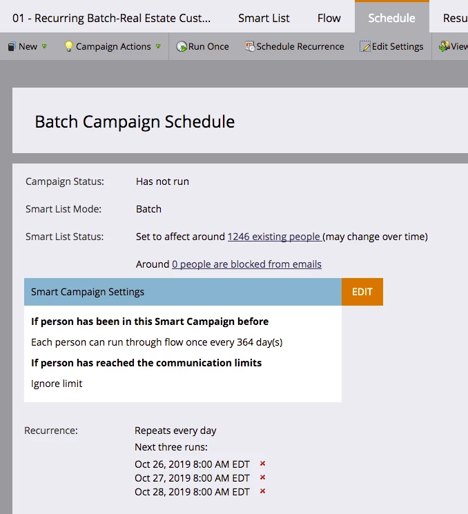 The recurring batch has 1,246 and is scheduled for every day @8am.