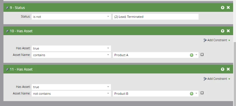 We tried using Asset is True and Asset Name contains Product A and Asset is True and Asset Name does not contain Product B but it did not work. In our world thousands can have product A and B but we need to at times send a communication to those who have Product A and exude B while removing those who have A & B combined.