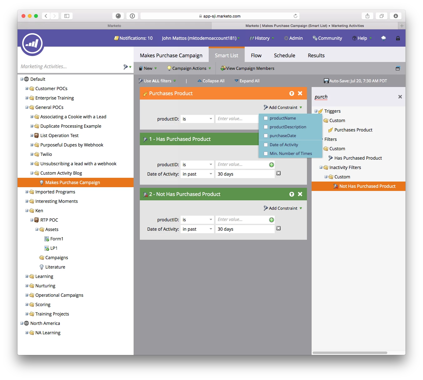 Let's take a look! The following screenshot shows the Trigger and two Filters that are created for you, and notice that your custom activity attributes are available as constraints. Cool right?!?! Think of all the cool possibilities. One thing that comes to mind is the creation of an activity like "Custom Form Fill". If you're using the SOAP or REST API to handle form fills in a custom way rather than using Marketo Forms, you don't get a "form fill" event.. but now you can emulate that with a custom Activity!