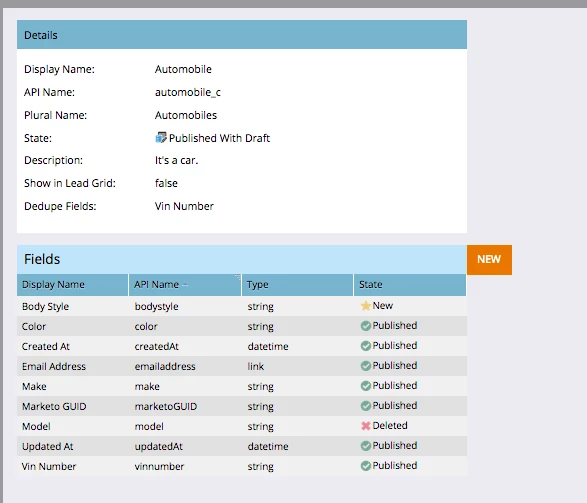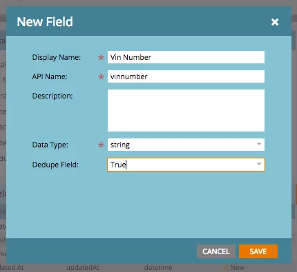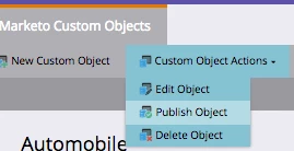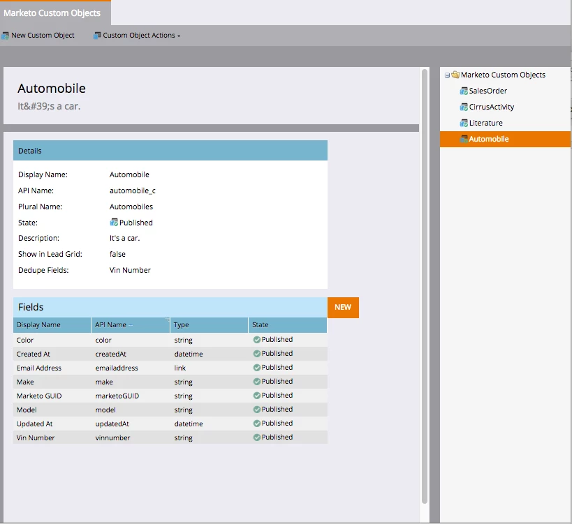 - a "Dedupe" field - This is another unique identifier that you can use to UPDATE existing custom objects once they're in Marketo. For example....if you're building a custom object called "Automobile" the Dedupe Field might be "VIN Number", which uniquely identifies the Automobile. When you go to update these objects, this is the field you use to identify the custom object, along with its associated Lead (Change the automobile with Vin=12345678 to now have a Color of "Green"). You can have one or more of these, as described in the special note below.