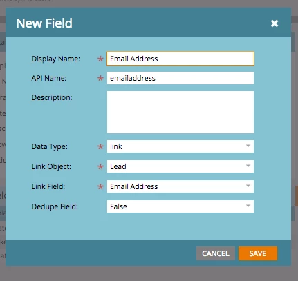 - a "Link" field - This field is the field that connects an object to the appropriate Marketo Lead or Company. you can choose Email Address, Marketo ID, or any custom field (Perhaps your company uses a unique "integration ID" for leads?). Please note. Be careful when creating the link field. This field, when you add data, MUST be a field that exists on the Lead or Company, and obviously must have a value on the Lead or Company that matches what you're upserting. Also, Ensure that the NAME and API NAME on the custom object match the API NAME on the Lead or Company. Trust me on this.