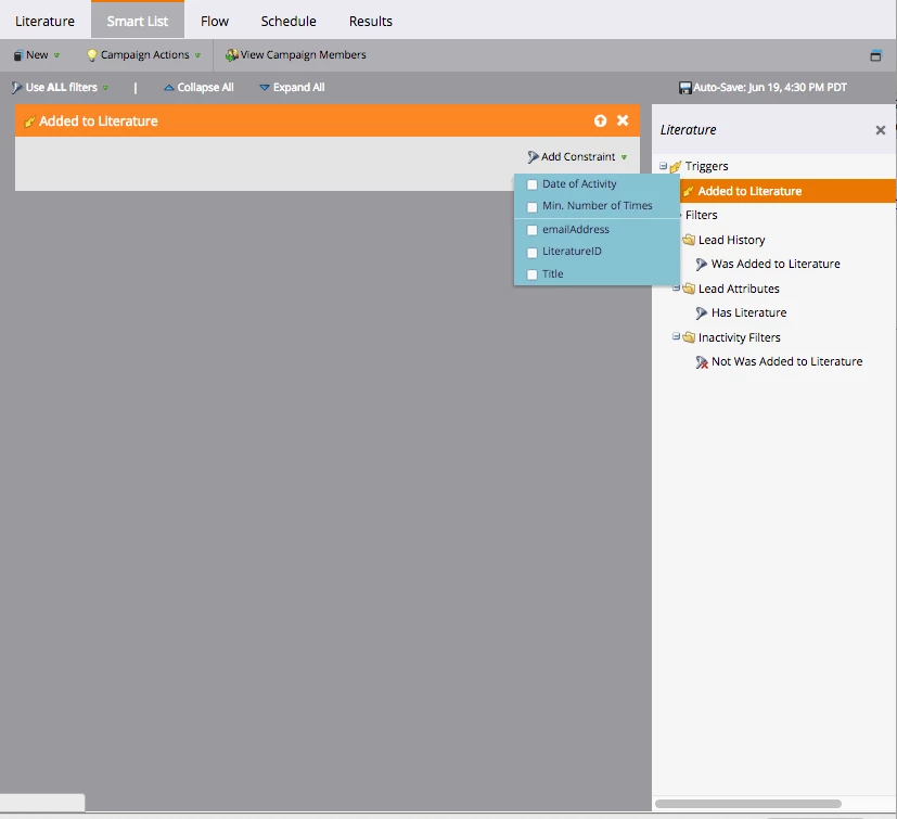 and as you can see.. the attributes of the Custom Object become constraints on the Filters and Trigger.