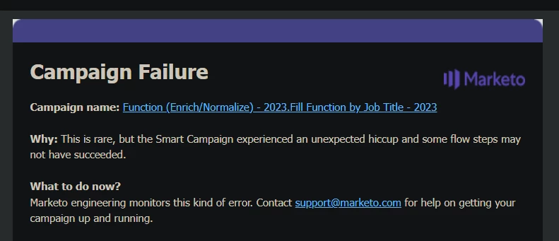 And btw, earlier today I received from Marketo a notification saying that there was an "unexpected hiccup" for this campaign and that some flow steps may not have succeeded... - see screen attached. This is quite weird.