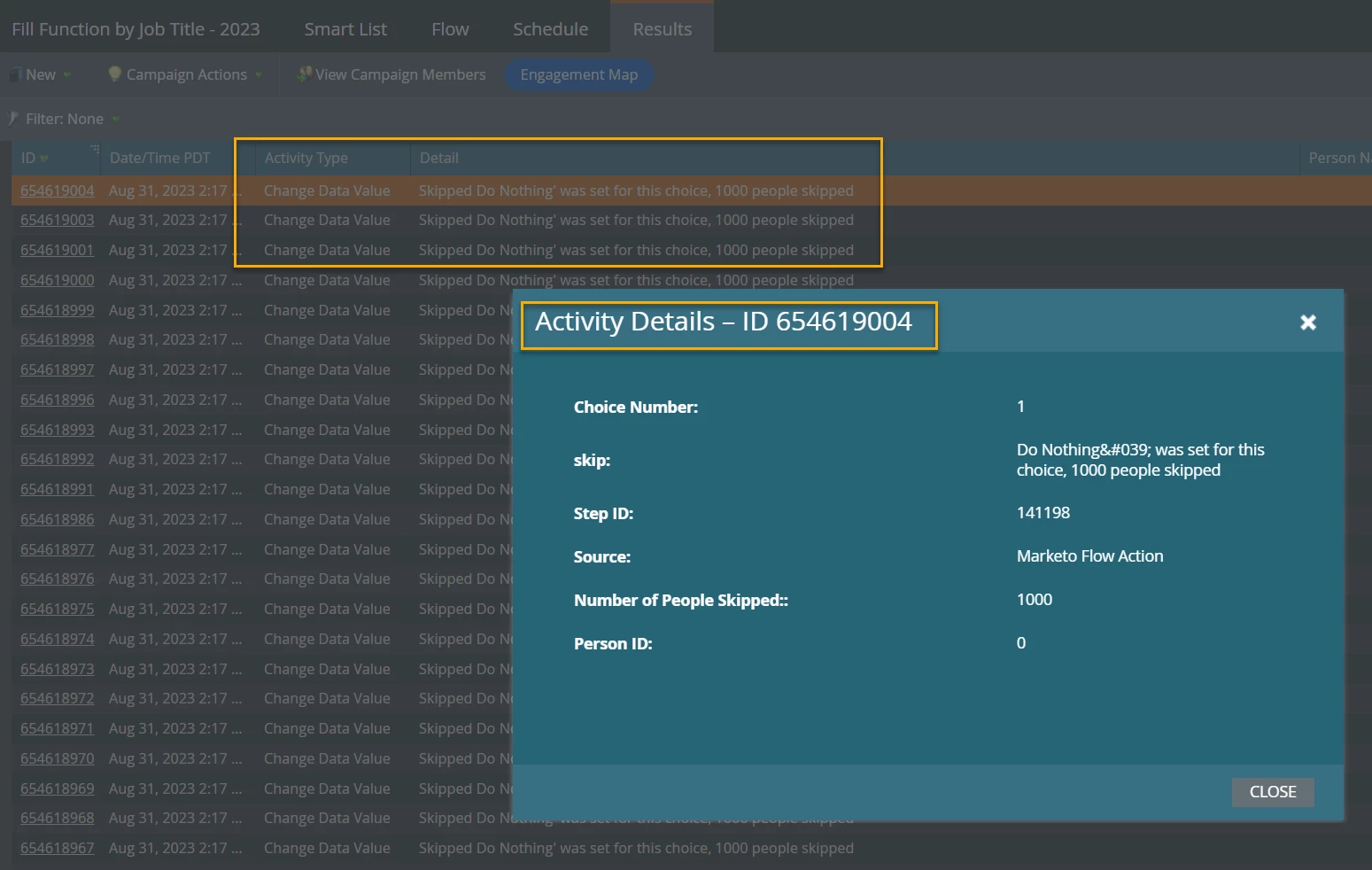 The first time I ran this, it processed 30% of the people, and now when I run it, it skips all the people - please see 2nd screenshot showing the campaign Results tab attached.