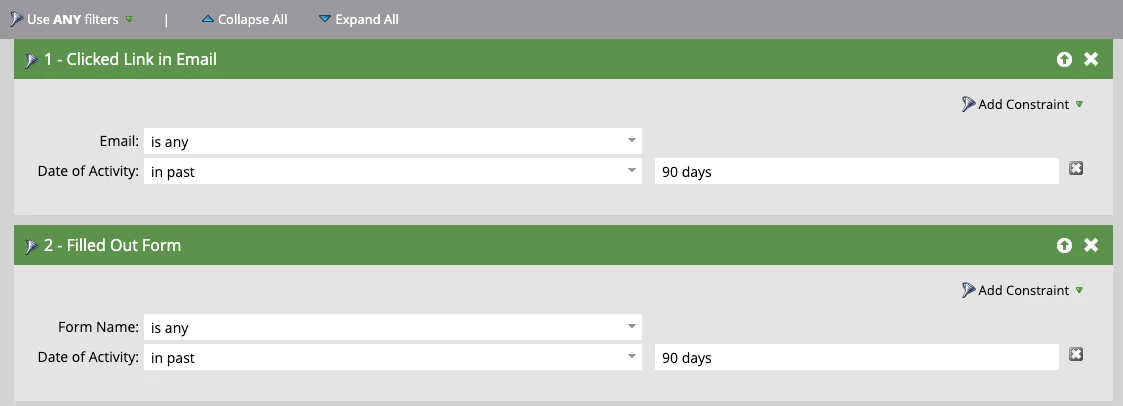 For the Clicked Link in Email filter specifically, I want to mention to not rely a lot on it to determine if a record is engaged or not, as a lot of times these clicks are from email scanners. If you have the bot filtering feature turned on and are logging bot activities in your subscription, you might also want to include the "Is Bot Activity = False" constraint in the "Clicked Link in Email" filter.