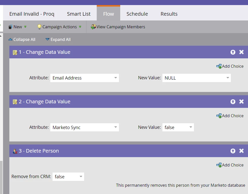 I have tried to set up a Smart Campaign that would NULL out the email address but that did not clear the email address. Below is the Flow that I put together.