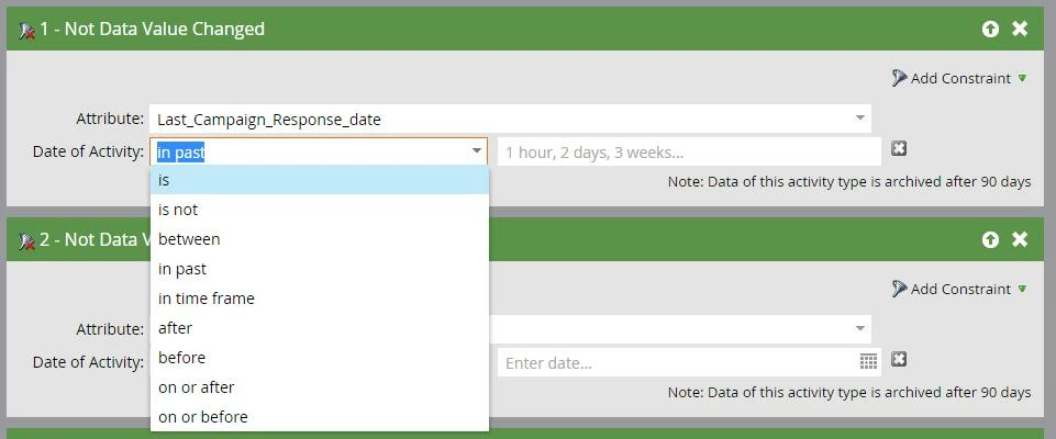 1. Should I use the "Not Data Changed Value" filter (im alittle confused by what the the note means when it says this activyt type is archived after 90 days)