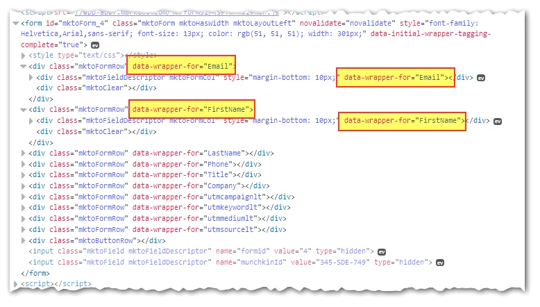 Note the .mktoForm as a whole is hidden until FormsPlus-Tag has added its special “I’m done tagging” flag, data-initial-wrapper-tagging-complete="true", to the form element. Otherwise, people would see Company for a moment before it disappears. You don’t want that!