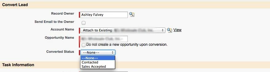 Then, even though this lead may not be Marketing Qualified or Sales Qualified, is converted, Salesforce asks for a converted status.