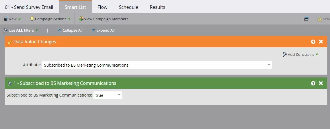 I'm trying to set up a smart campaign that sends out a survey 30 days after a member creates a profile on our new website. After activating the campaign we were seeing that new profiles were being created, but they weren't showing up as leads within this campaign. I'm struggling to figure out why. When a new member creates a profile they agree to receive our Marketing Communications, so they should be passing though. I've attached images of the smart list and flow for reference.