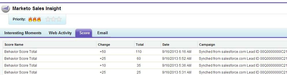 When reps go to the Scoring tab in SF in Sales Insight, it’s basically useless. They see the values but there don’t see the campaigns that triggered the Total Score because Total Score is calculated. There is no answer to “Why did that score increase?”