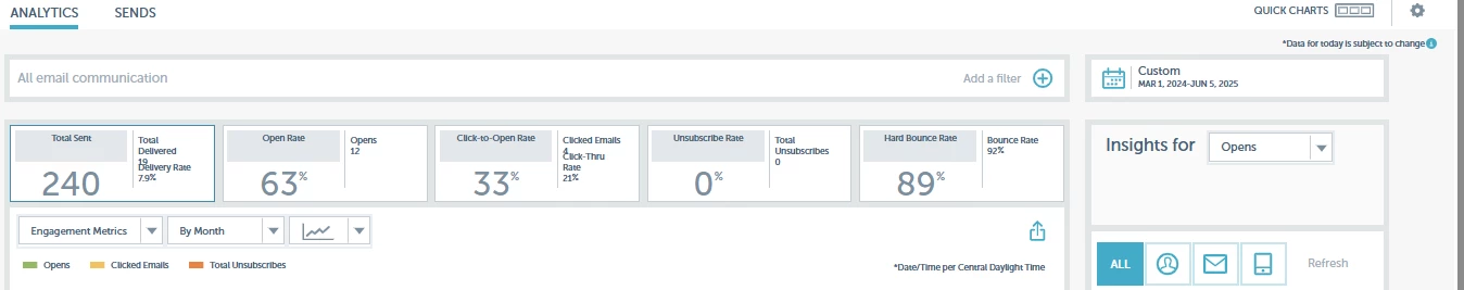 I am seeing differences between email insights and email performance reports for the same set of emails i.e engagement programs and email programs. The opens and clicks specifically don't match for the same timeframe. Please advise.