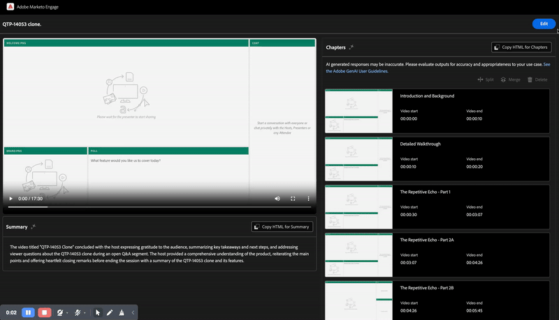 Now picture your webinar auto-divided into neat chapters with smart titles. Even better, you can edit, merge, or re-title chapters with just a few clicks for a fully customized experience.