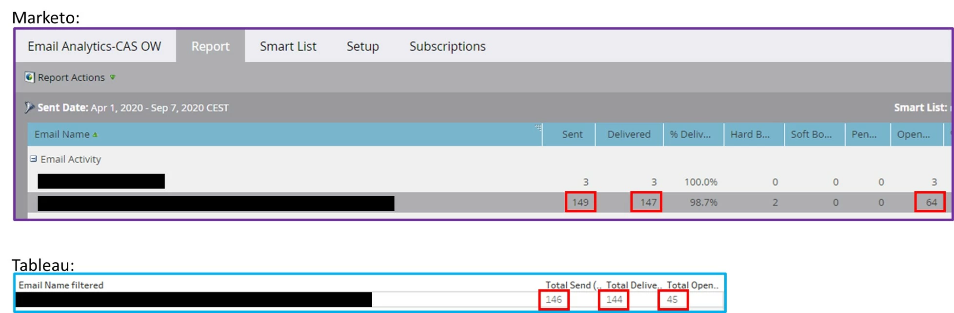 In the picture, you can see the Email Report from Marketo and the API Data in Tableau. In most cases, the data is about the same order of magnitude, but never identical. Especially "Opens" seem to differ more than the other KPIs. (same email, date range and filters)
