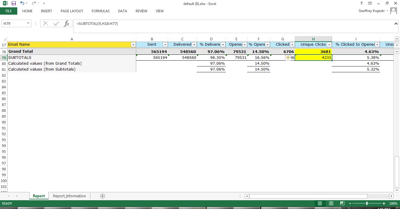 When I run a Subtotal formula in an excel export of my RCE Email Performance by Name report, I am getting different values.