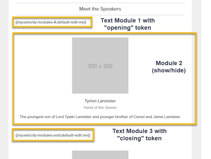 Displaying email modules based on the velocity script token applied in the email editor