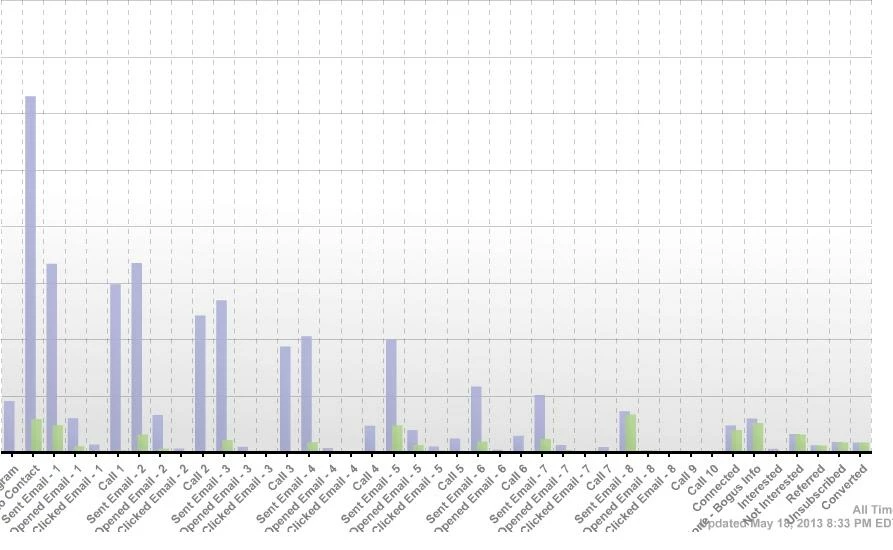 The progression status values repeat for up to 8 emails and calls.  Because we have these, the reps can look at the campaign member status and instantly see where the lead is in the campaign.  Also, the telemarketing manager can look at the summary graph (screen shot below) and see where the campaign is at any point and identify choke points.