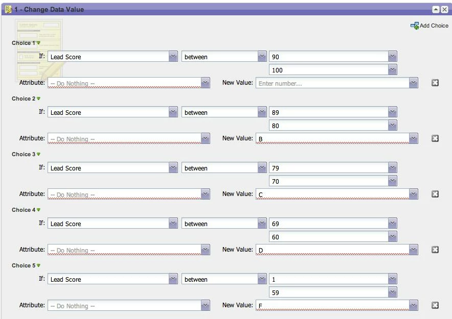 It would look roughly like the image below (Lead Attribute for change would be "Lead Grade"):
