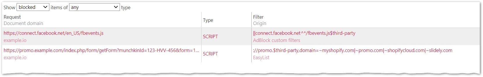 So the perfect storm is when another of your sites, like https://www.example.io, loads embedded forms from https://promo.example.com. Or, of course, if you have a partner embedding your forms on https://channel.partner.example. Even if you’re the owner of both sites, from AdBlock’s standpoint, that’s a 3rd-party call, and the specific prohibition on promo.example.com comes into play.