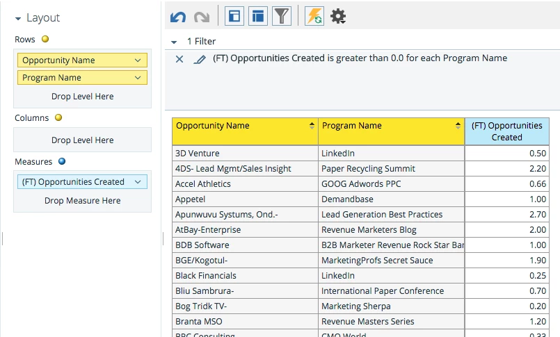 In First Touch analysis Marketo divides opportunities across multiple contacts associated with the opportunity. This prevents us from understanding which Program actually drove the first touch for a new opportunity. This type of attribution division should be reserved for Multi-Touch analysis only and First Touch attribution should go to the first engagement with a representative from a company (a contact).