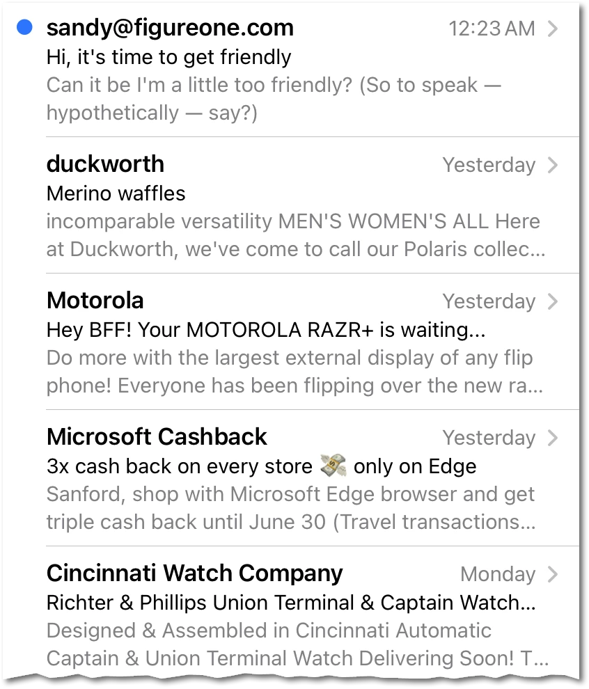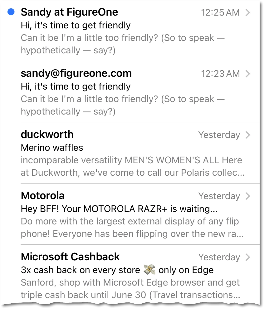 The app sees the display name “Sandy @ FigureOne” as a possible phishing attempt because it looks like an email address but doesn’t match the real address (“sandy@figureone.com”).