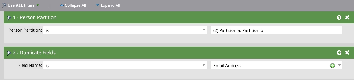 For example, we need to create a smart list which will help us identify duplicate records/ members in partition 1 and partition 2.